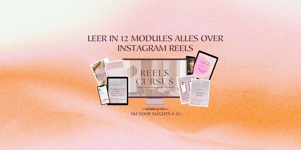 Deze cursus is speciaal voor kappers en beauty-experts die hun aanwezigheid op Instagram willen vergroten, zonder daarbij veel tijd te verliezen. We nemen je stap voor stap mee hoe iedere functie werkt. We beginnen bij de basis en gaan door naar gevorderd, dat maakt deze Reels cursus dus voor iedereen!